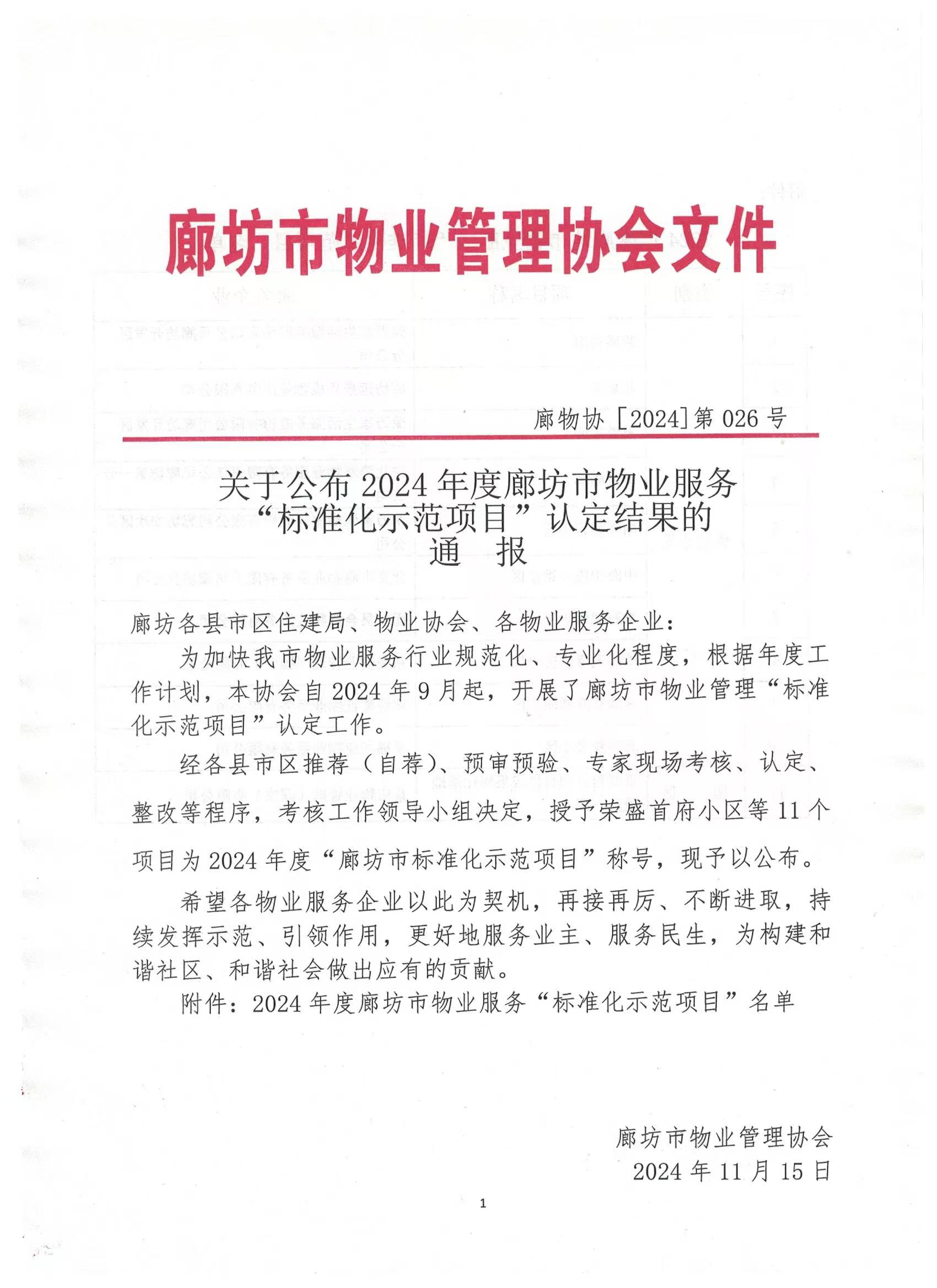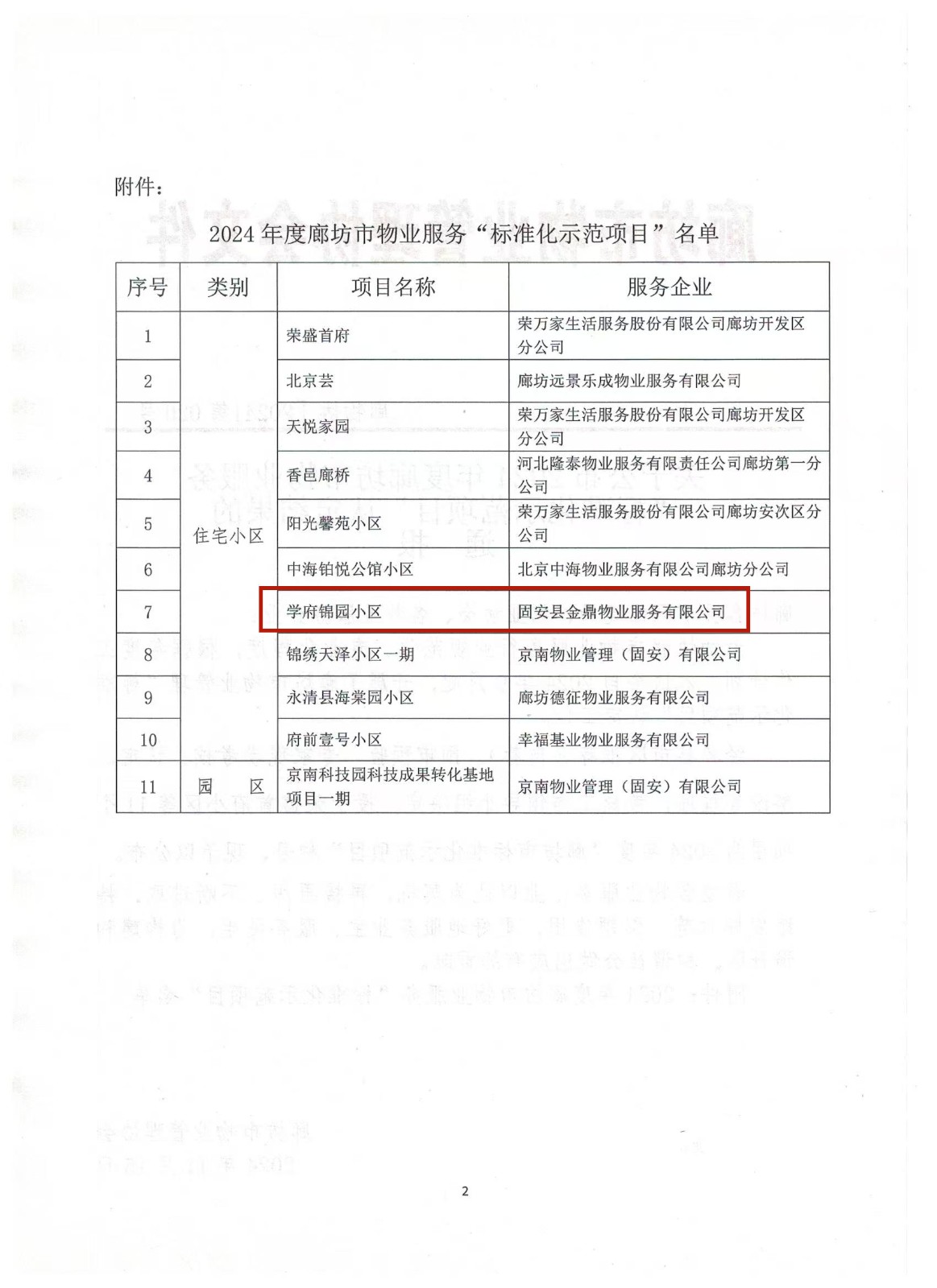近日,廊坊市物业管理协会公布《关于公布2024年度廊坊市物业服务“标准化示范项目”认定结果的通报》,本次评选廊坊市仅有10个小区获得此荣誉称号。其中,金鼎物业服务项目学府·锦园通过预审预验、专家现场考核、认定等程序,荣获2024年度“廊坊市标准化示范项目”称号,并正式挂牌。